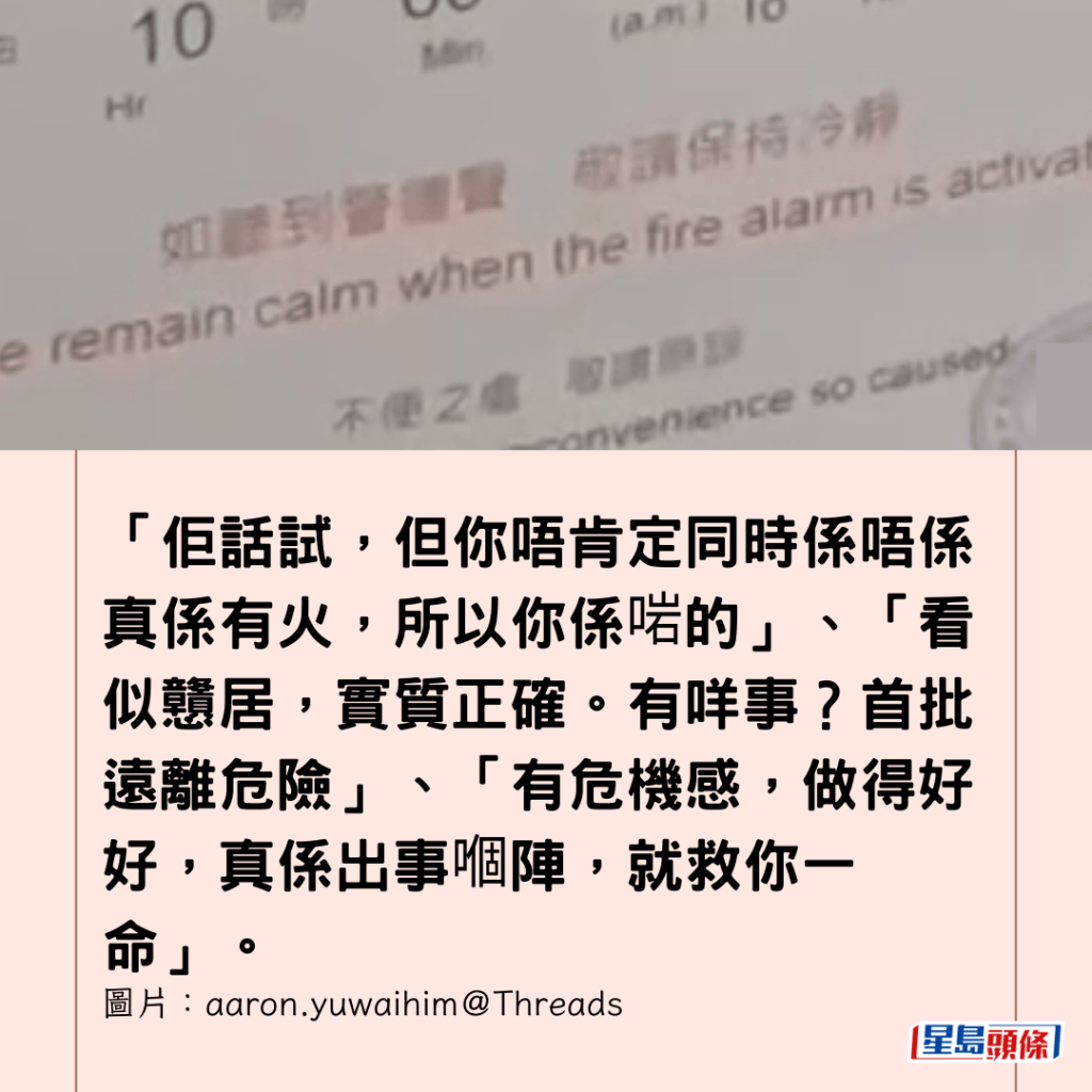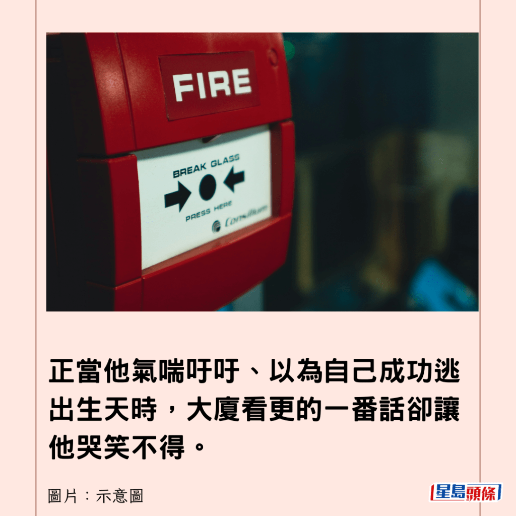 正當他氣喘吁吁、以為自己成功逃出生天時,大廈看更的一番話卻讓他哭笑不得。看更告訴他,剛剛只是例行測試火警鐘,更「表揚」他是「全棟樓唯一一個跑落嚟走火警嘅住客」,其他住戶都只是打電話到管理處詢問情況。
