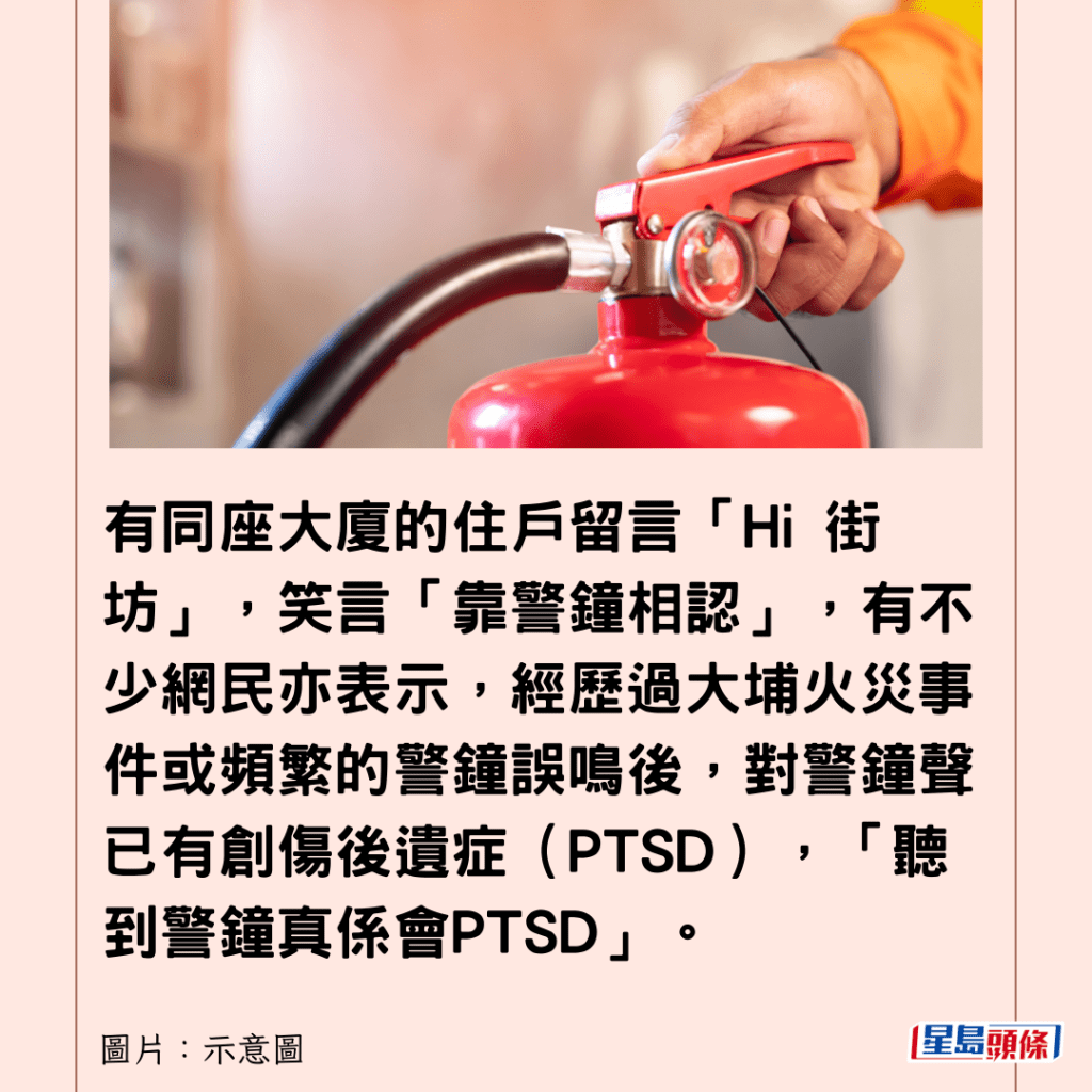 有同座大廈的住戶留言「Hi 街坊」,笑言「靠警鐘相認」,有不少網民亦表示,經歷過大埔火災事件或頻繁的警鐘誤鳴後,對警鐘聲已有創傷後遺症(PTSD),「聽到警鐘真係會PTSD」。