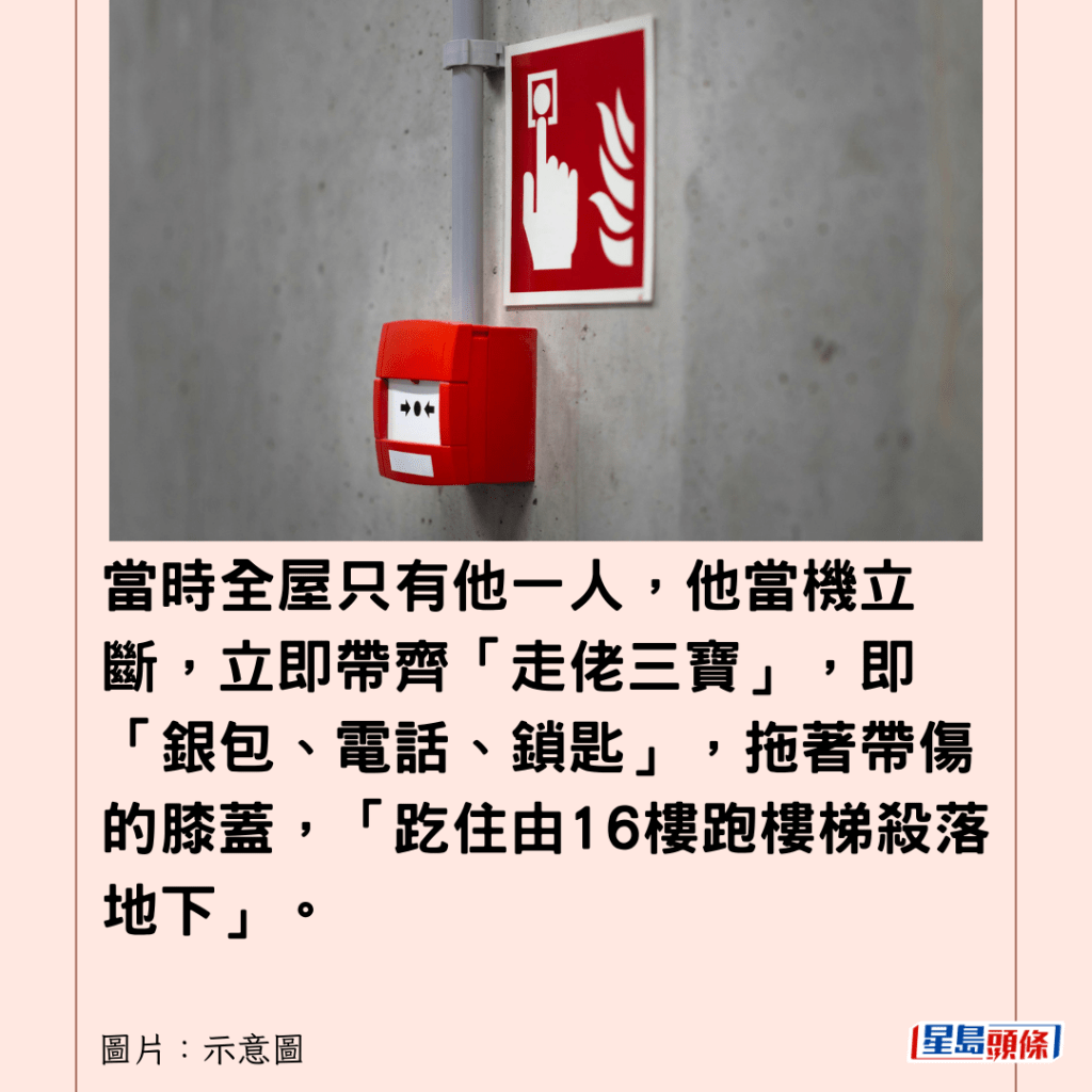 有美孚網民晚上因火警鐘大響,腳傷在身的他,仍「趷住由16樓,跑樓梯殺落地下」,到大堂發現全棟樓竟只得他一人走火警,管理員的一句話令事主當場崩潰,事件引發網民熱議,不少人大讚事主是「年度最佳住客」,危機意識爆燈。