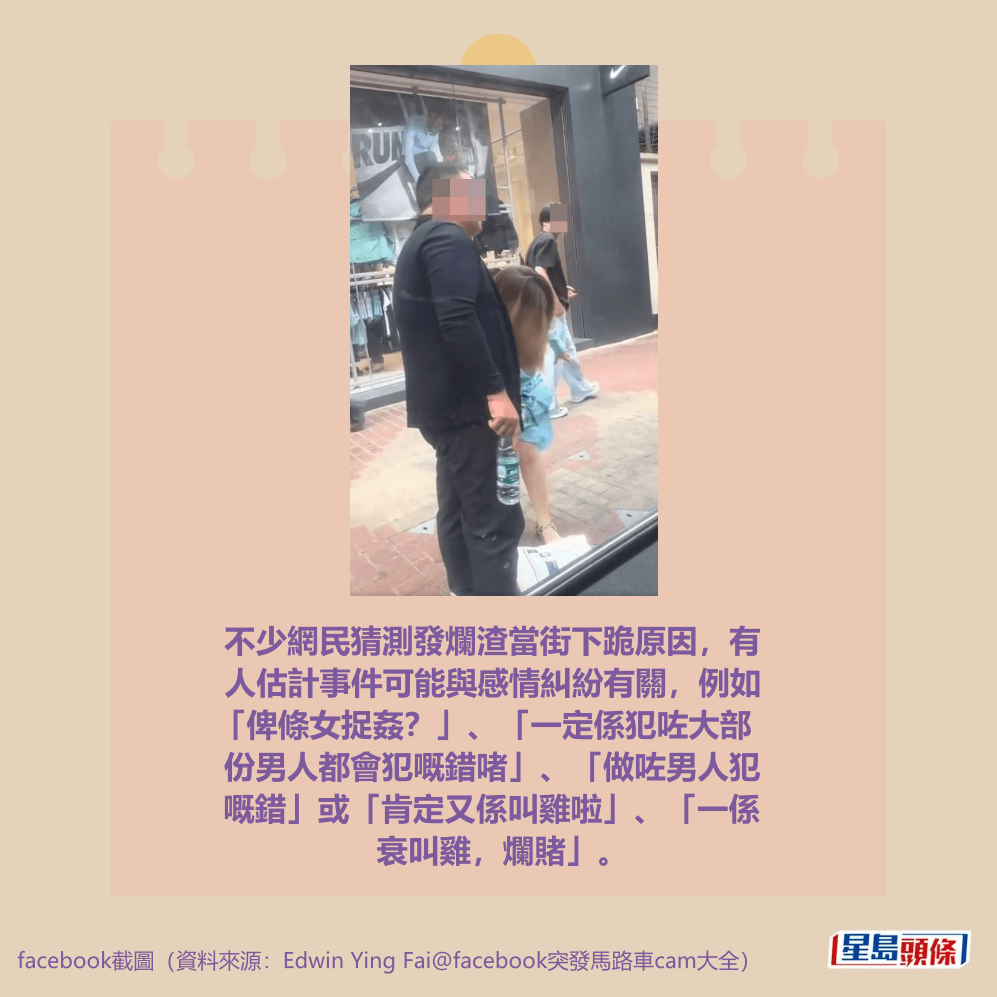 不少網民猜測發爛渣當街下跪原因,有人估計事件可能與感情糾紛有關,例如「俾條女捉姦?」、「一定係犯咗大部份男人都會犯嘅錯啫」、「做咗男人犯嘅錯」或「肯定又係叫雞啦」、「一係衰叫雞,爛賭」。