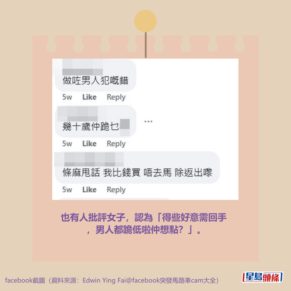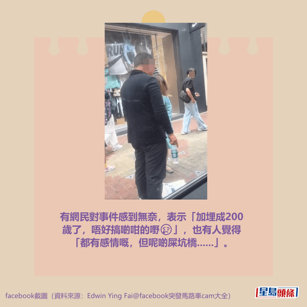 有網民對事件感到無奈,表示「加埋成200歲了,唔好搞啲咁的嘢😢」,也有人覺得「都有感情嘅,但呢啲屎坑橋……」;也有人批評女子,認為「得些好意需回手,男人都跪低啦仲想點?」。