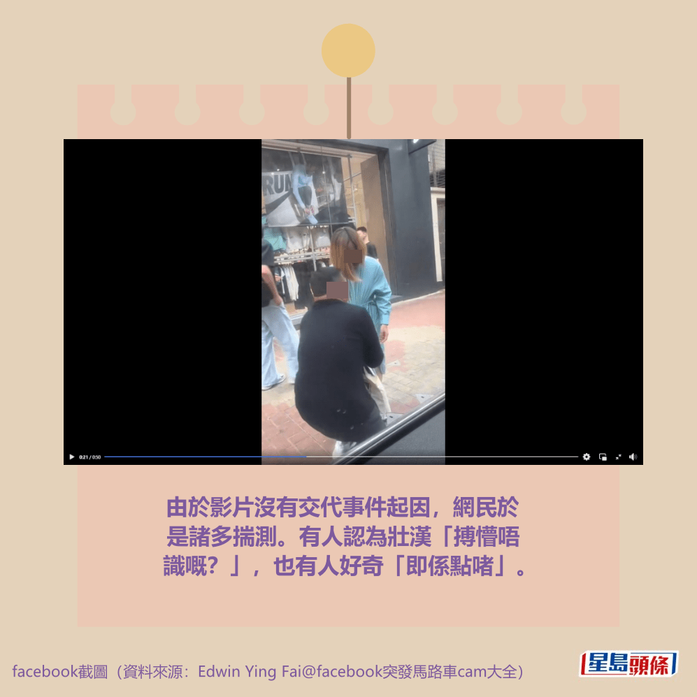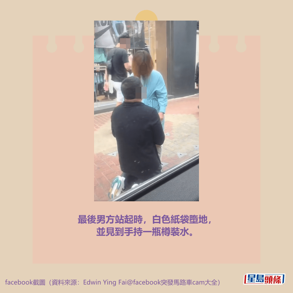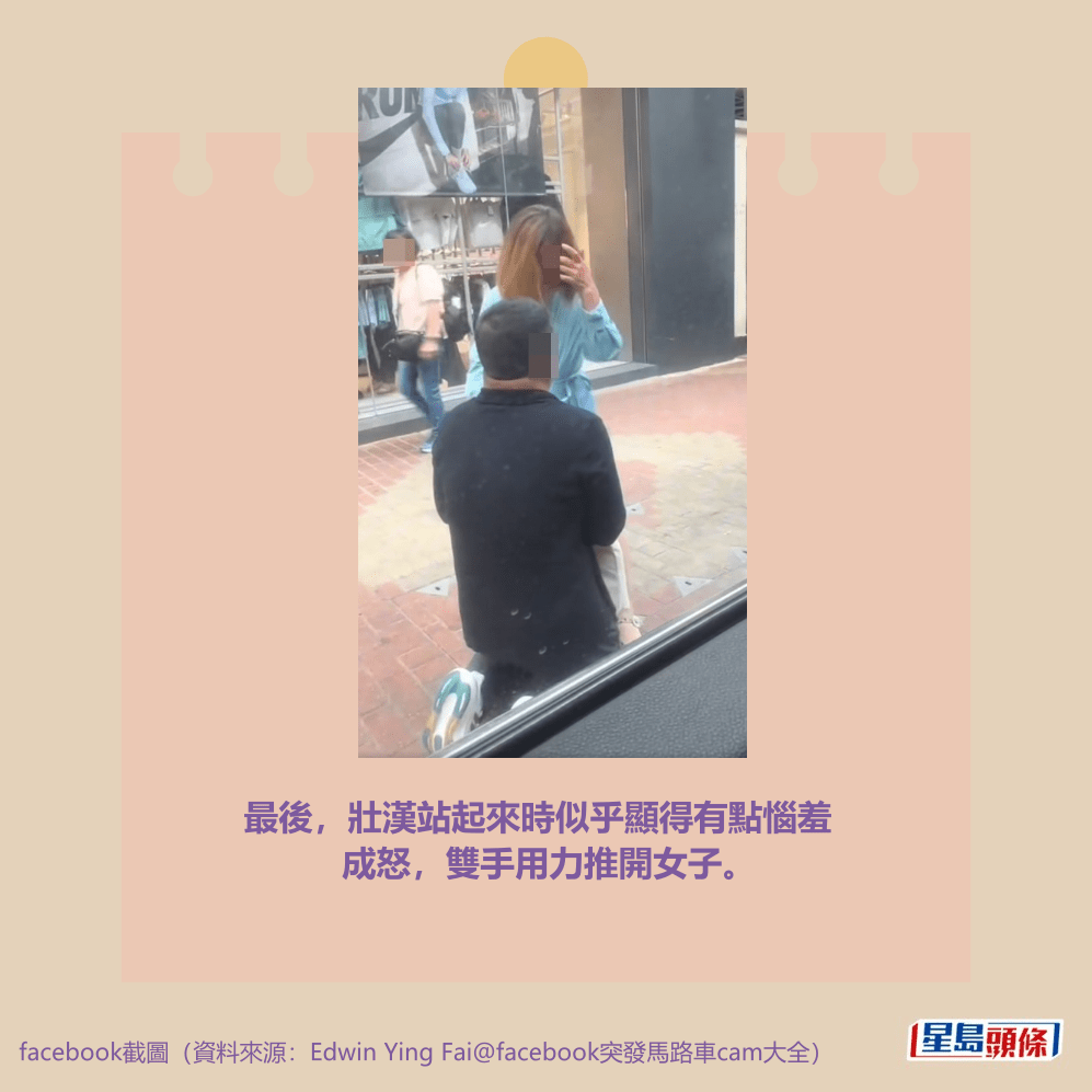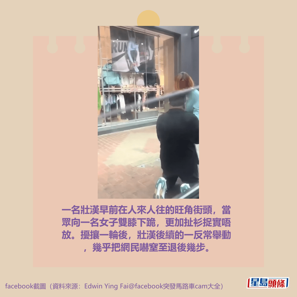 一名壯漢早前在人來人往的旺角街頭,當眾向一名女子雙膝下跪,更加扯衫捉實唔放。擾攘一輪後,壯漢後續的一反常舉動,幾乎把網民嚇窒至退後幾步。詳情見下圖及下文: