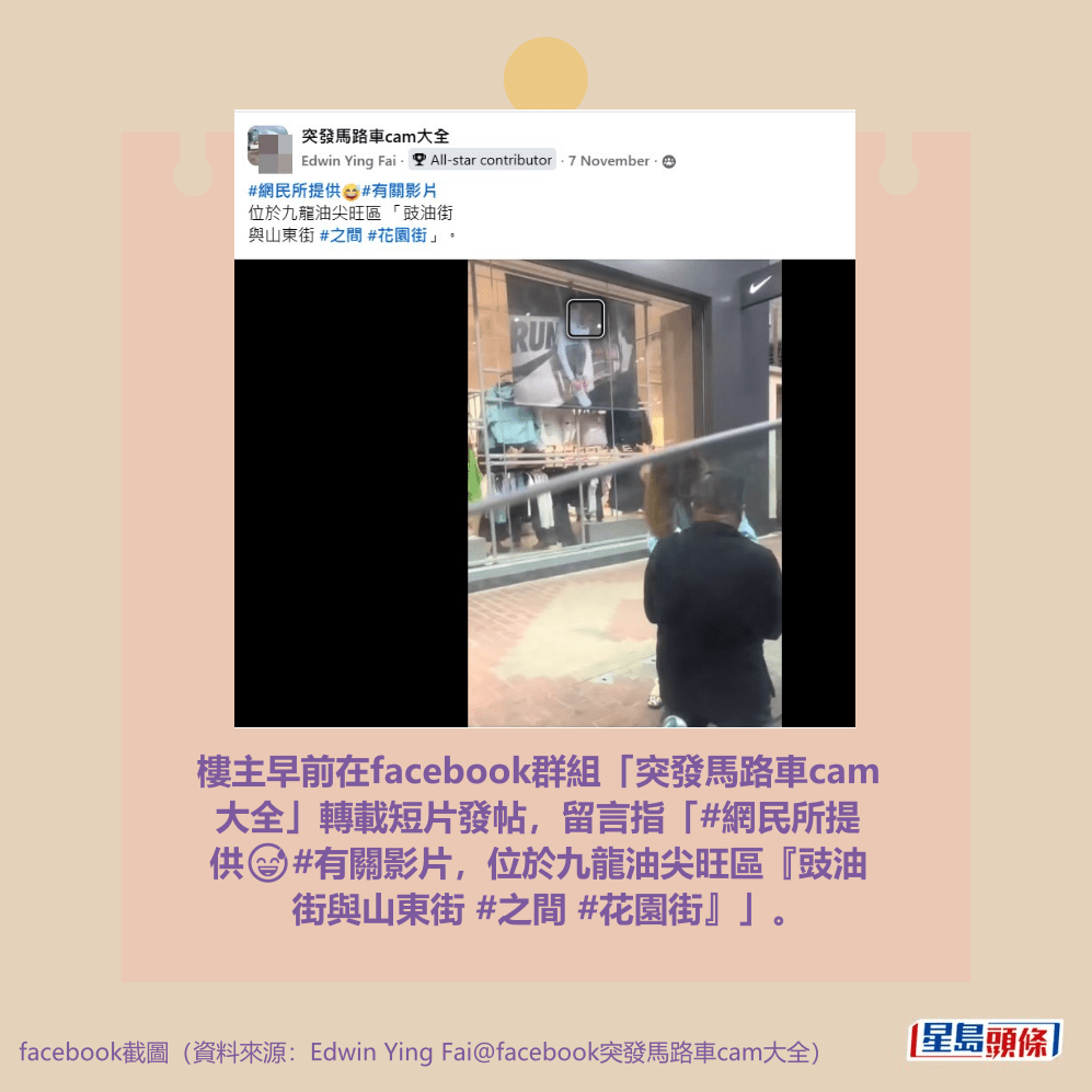 樓主早前在facebook群組「突發馬路車cam大全」轉載短片發帖,留言指「#網民所提供😅#有關影片,位於九龍油尖旺區『豉油街與山東街 #之間 #花園街』」。
