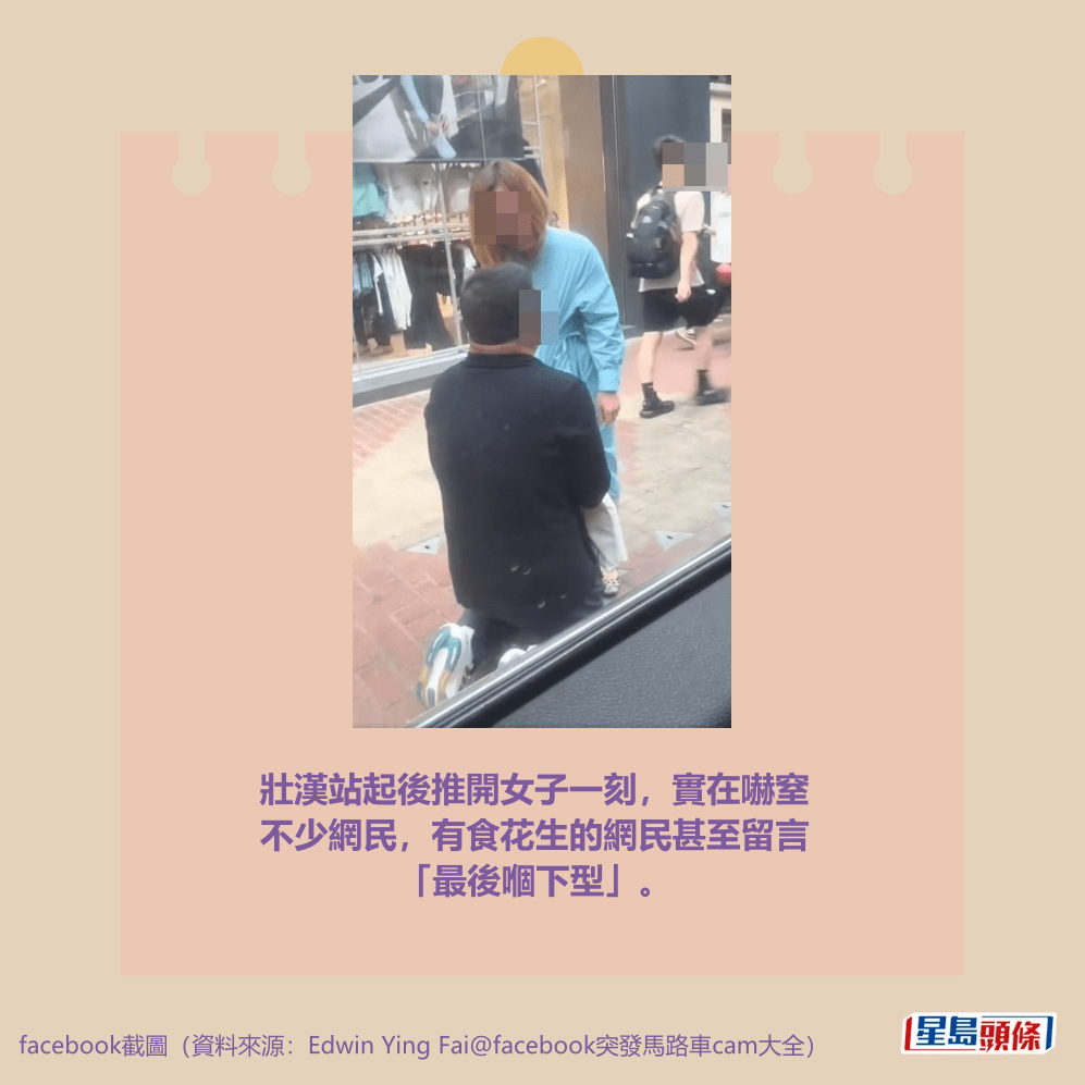 壯漢站起後推開女子一刻,實在嚇窒不少網民,有食花生的網民甚至留言「最後嗰下型」;有人則形容為「反轉豬肚就係屎嘅演繹」、「一啖沙糖一啖屎😂😂😂」、「又要跪,人哋唔show(騷)你又發爛渣」。