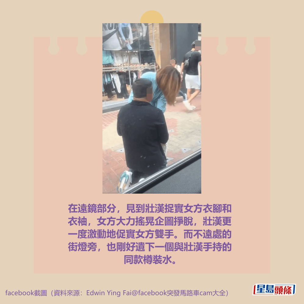 在遠鏡部分,見到壯漢捉實女方衣腳和衣袖,女方大力搖晃企圖掙脫,壯漢更一度激動地促實女方雙手。而不遠處的街燈旁,也剛好遺下一個與壯漢手持的同款樽裝水。