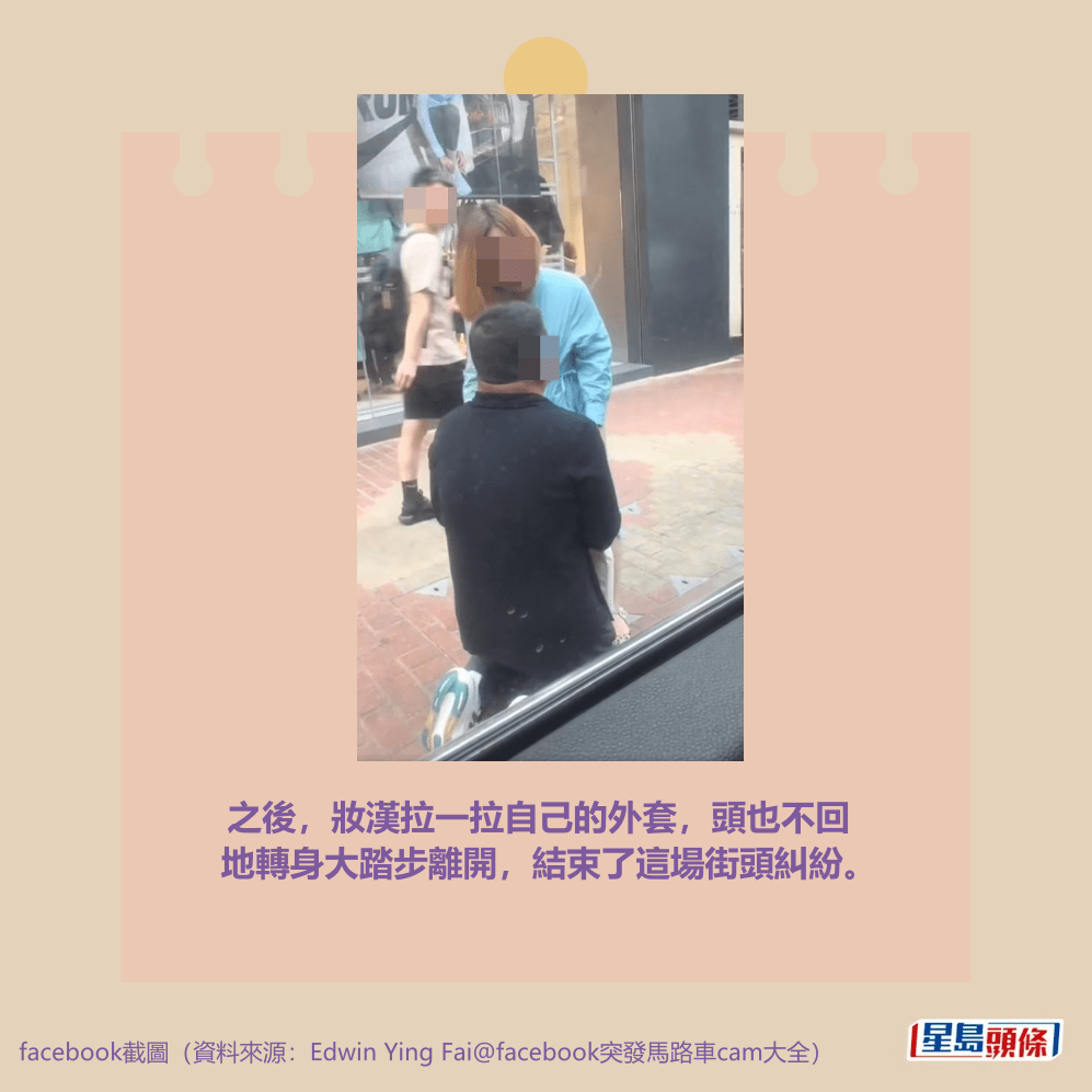 最後,壯漢站起來時似乎顯得有點惱羞成怒,雙手用力推開女子後,拉一拉自己的外套,頭也不回地轉身大踏步離開,結束了這場街頭糾紛。