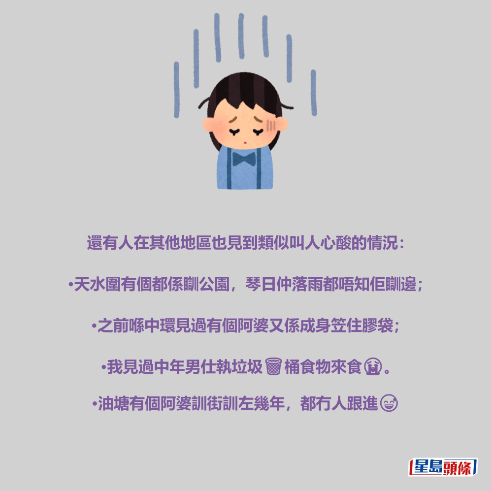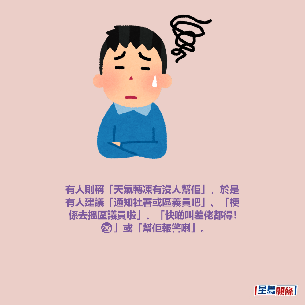 有人則稱「天氣轉凍有沒人幫佢」,於是有人建議「通知社署或區義員吧」、「梗係去搵區議員啦」、「快啲叫差佬都得!😰」或「幫佢報警喇」。