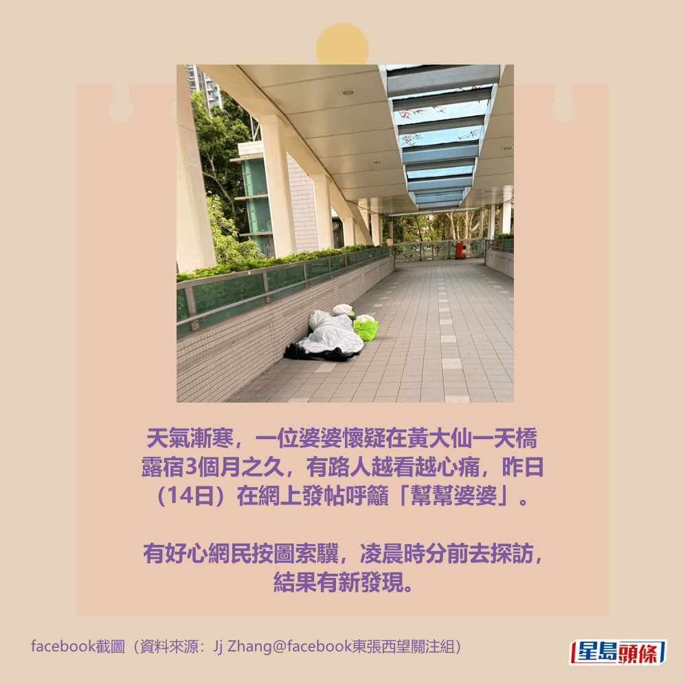 樓主昨日在facebook群組「東張西望關注組」上載相片發帖,留言指「婆婆喺條橋住咗3個月啦!天氣越嚟越凍!幫幫婆婆!🙏」。樓主在回應欄補充「黃大仙天橋度,朝早同夜晚返工都見到」。