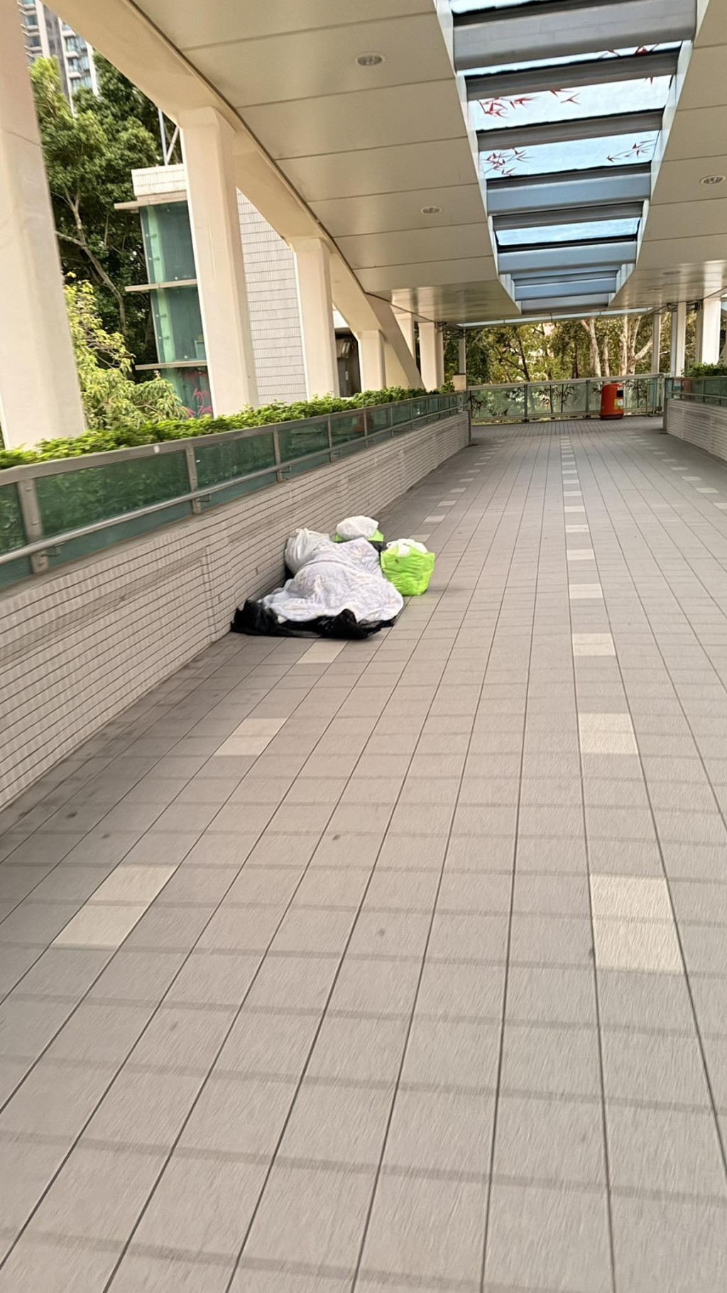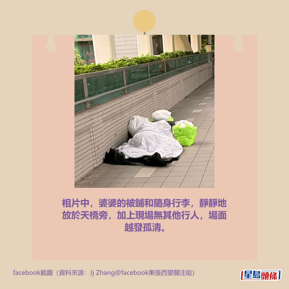 相片中,婆婆的被鋪和隨身行李,靜靜地放於天橋旁,加上現場無其他行人,場面越發孤清。有網民估計現場可能是「黃大仙龍翔道新光中心行人天橋上面!」、「沙田坳道嗰條橋」。