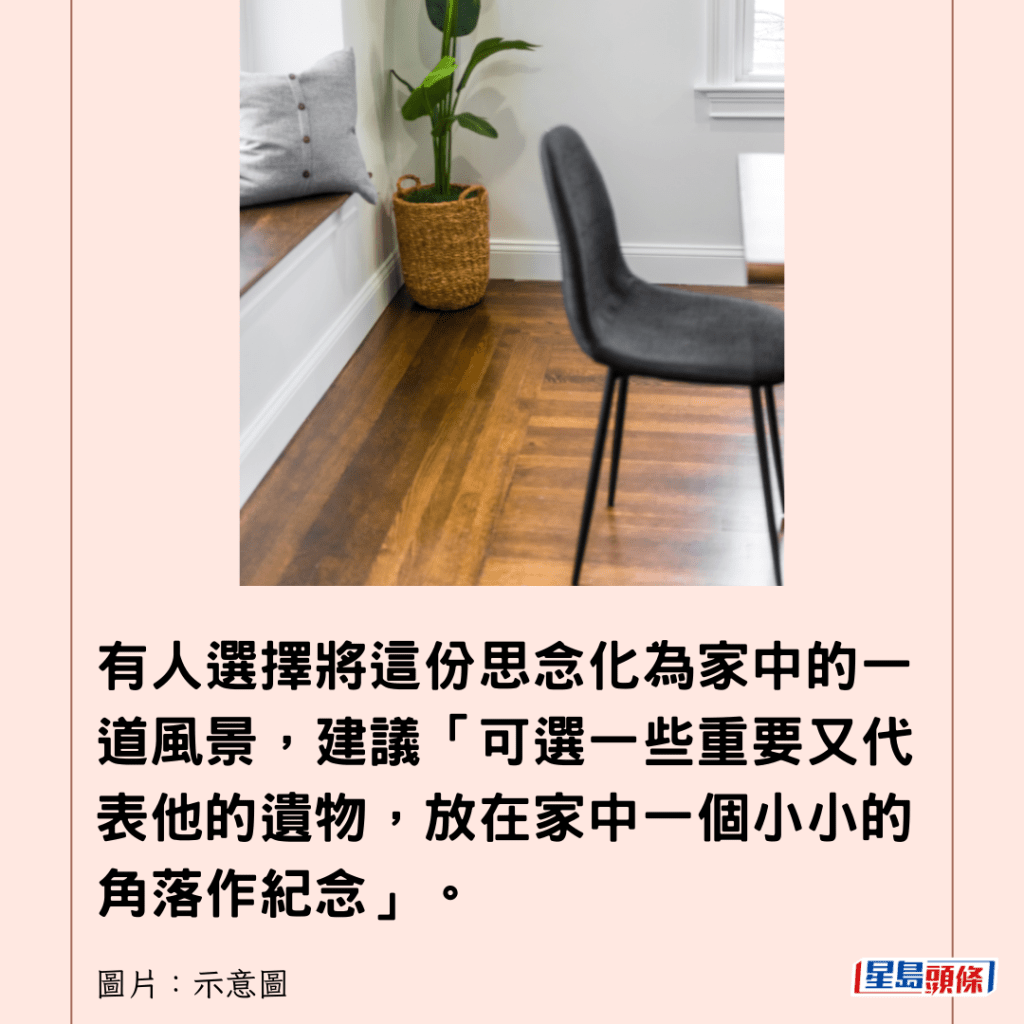 有人選擇將這份思念化為家中的一道風景,建議「可選一些重要又代表他的遺物,放在家中一個小小的角落作紀念」。