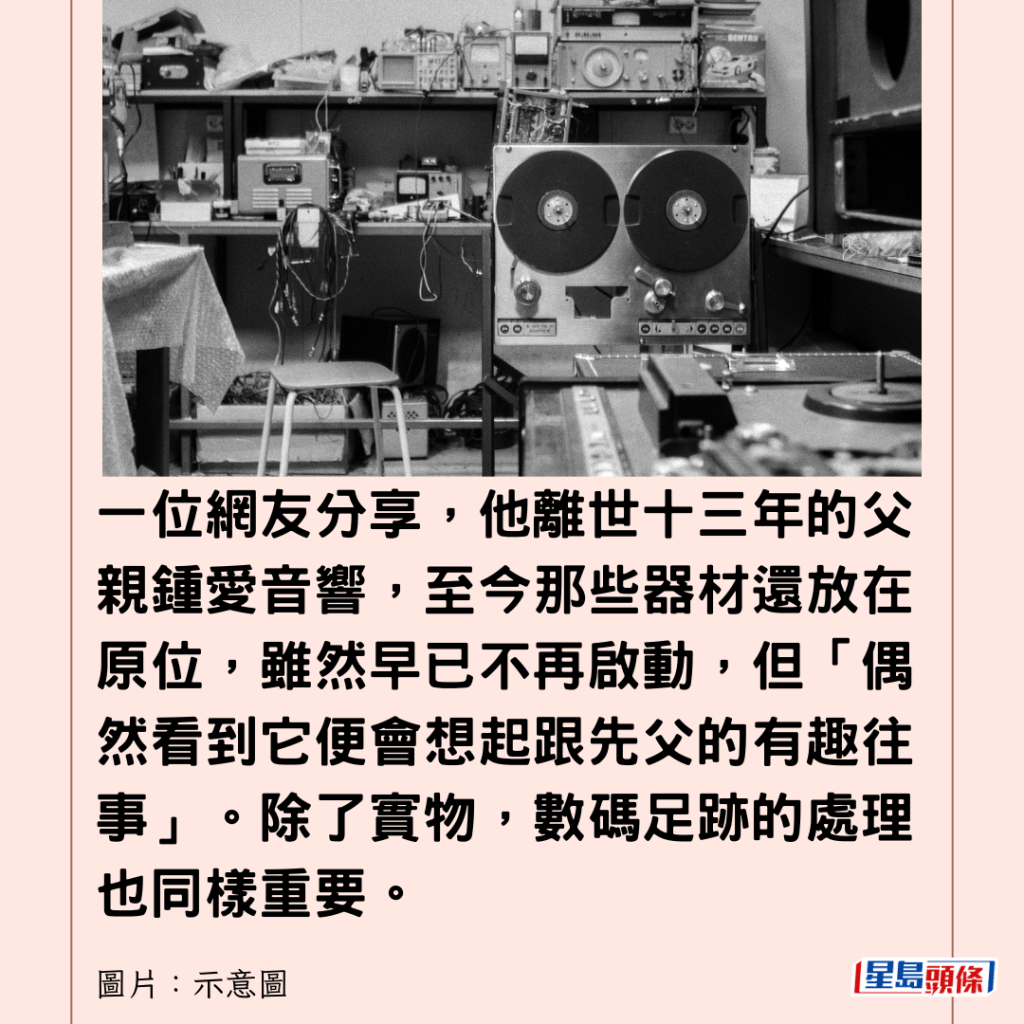 一位網友分享,他離世十三年的父親鍾愛音響,至今那些器材還放在原位,雖然早已不再啟動,但「偶然看到它便會想起跟先父的有趣往事」。除了實物,數碼足跡的處理也同樣重要。
