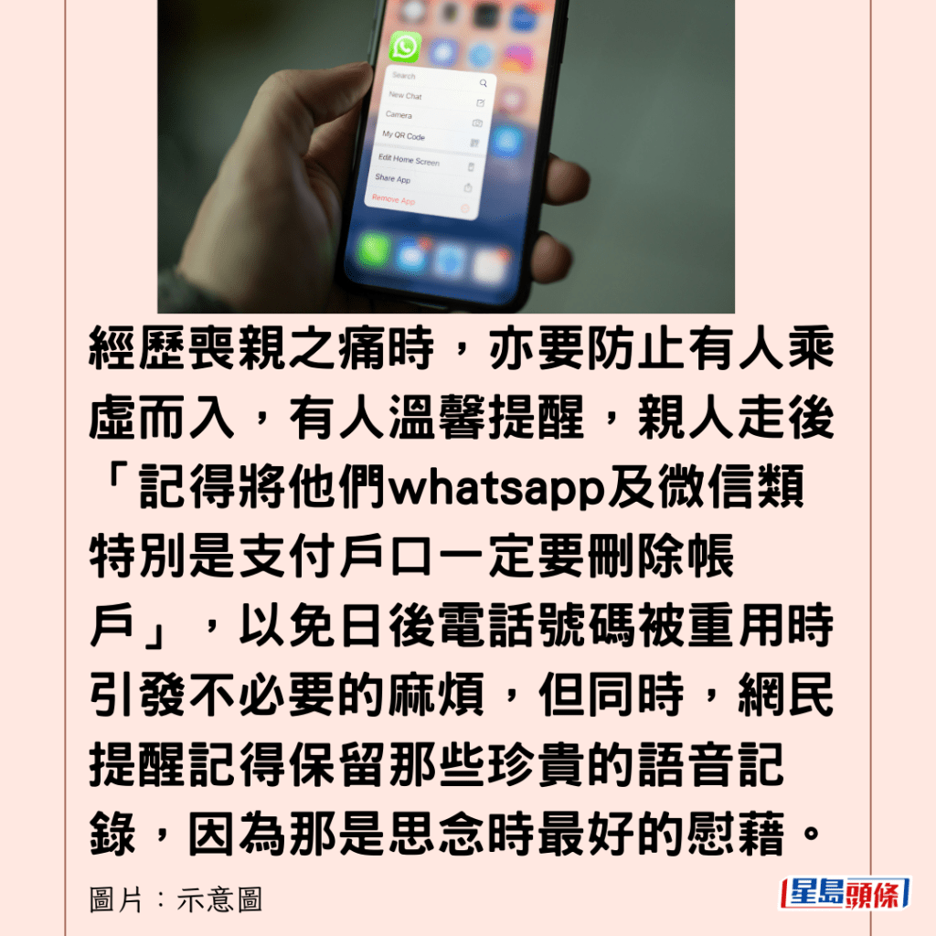經歷喪親之痛時,亦要防止有人乘虛而入,有人溫馨提醒,親人走後「記得將他們whatsapp及微信類特別是支付戶口一定要刪除帳戶」,以免日後電話號碼被重用時引發不必要的麻煩,但同時,網民提醒記得保留那些珍貴的語音記錄,因為那是思念時最好的慰藉。