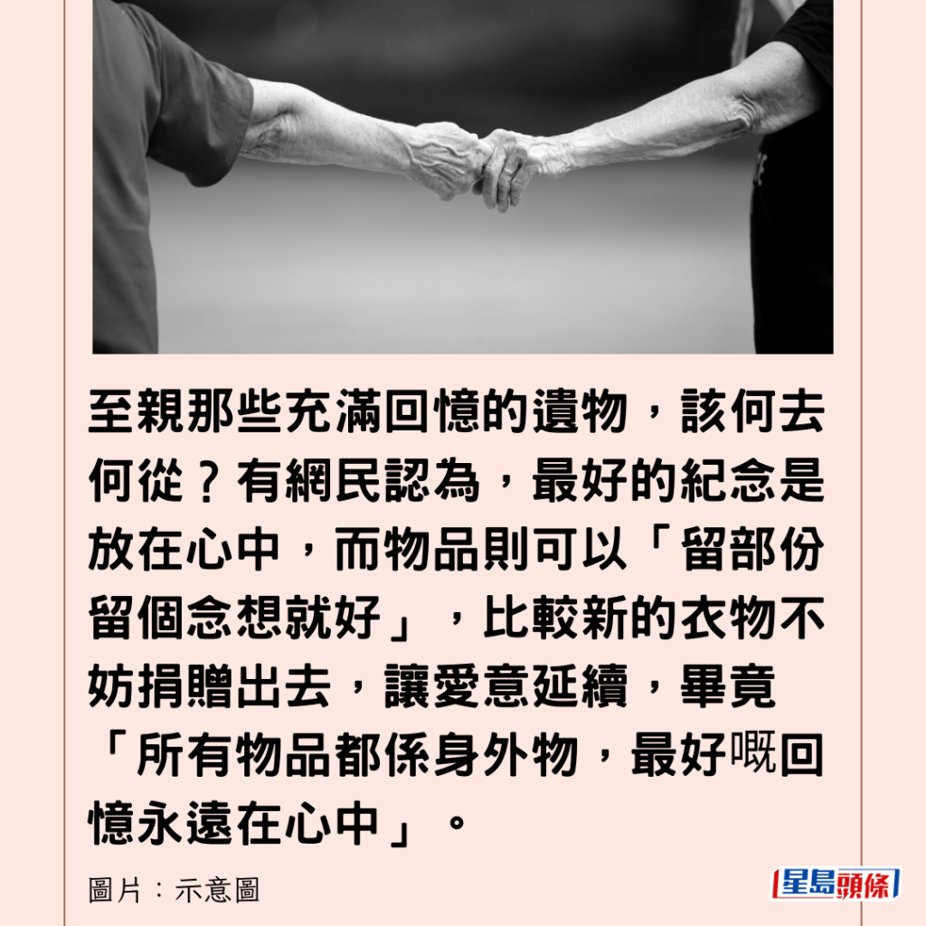 至親那些充滿回憶的遺物,該何去何從?有網民認為,最好的紀念是放在心中,而物品則可以「留部份留個念想就好」,比較新的衣物不妨捐贈出去,讓愛意延續,畢竟「所有物品都係身外物,最好嘅回憶永遠在心中」。