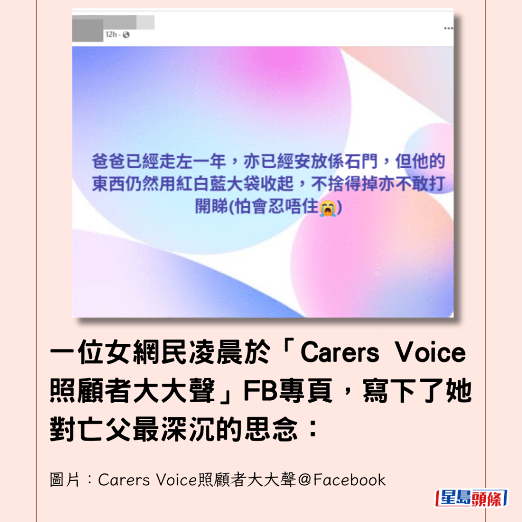一位女網民今日(16日)凌晨於「Carers Voice照顧者大大聲」FB專頁,寫下了她對亡父最深沉的思念:「爸爸已經走咗一年,亦已經安放係石門(石門靈灰安置所),但他的東西仍然用紅白藍大袋收起,不捨得掉亦不敢打開睇(怕會忍唔住)。」