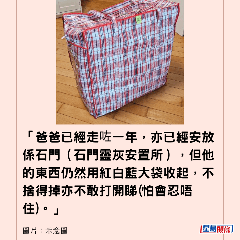 「爸爸已經走咗一年……但他的東西仍然用紅白藍大袋收起……」,有女網民今日(16日)半夜凌晨在社交平台發文,道盡了對已故父親的無盡思念與不捨,這沉重的紅白藍袋令不少網民淚腺瞬間崩潰,亦揭開了孝順子女的「最痛秘密」,引來全網共鳴。