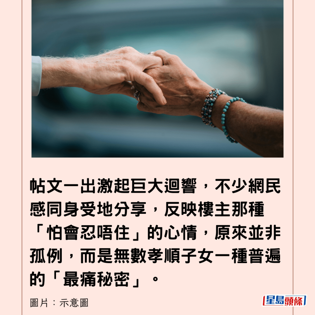 帖文一出激起巨大迴響,不少網民感同身受地分享,反映樓主那種「怕會忍唔住」的心情,原來並非孤例,而是無數孝順子女一種普遍的「最痛秘密」。