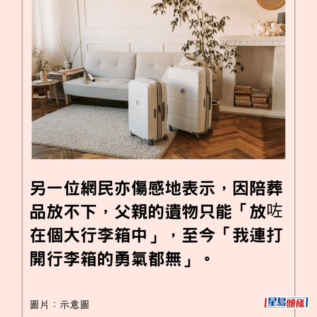 另一位網民亦傷感地表示,因陪葬品放不下,父親的遺物只能「放咗在個大行李箱中」,至今「我連打開行李箱的勇氣都無」。