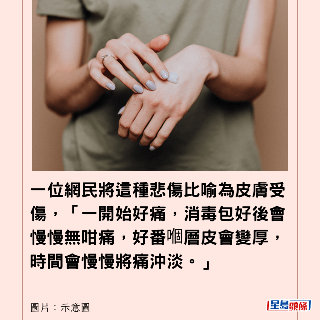 一位網民將這種悲傷比喻為皮膚受傷,「一開始好痛,消毒包好後會慢慢無咁痛,好番嗰層皮會變厚,時間會慢慢將痛沖淡。」
