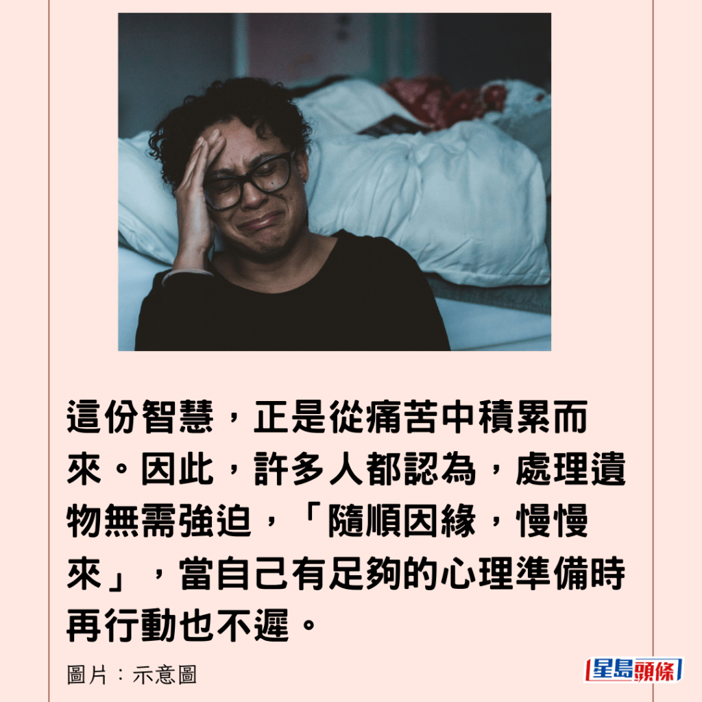 這份智慧,正是從痛苦中積累而來。因此,許多人都認為,處理遺物無需強迫,「隨順因緣,慢慢來」,當自己有足夠的心理準備時再行動也不遲。