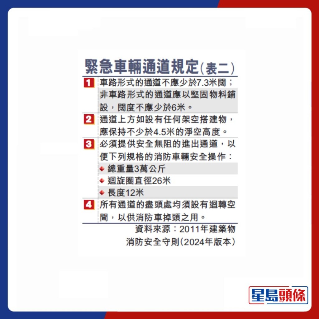 現行法例規定,每座建築物須設有緊急車輛通道,確保消防處車能直達火場。根據《2011年建築物消防安全守則》(2024年版本),車路形式的緊急車輛通道闊度不得少於7.3米,非車路形式的通道應以堅固物料鋪設,不少於6米闊;通道上方如有任何架空搭建物,應保持不少於4.5米的淨空高度。《守則》亦要求,通道應安全無阻、盡頭設迴轉空間,並須讓總重量3萬公斤(30噸)、迴轉圈直徑26米及長度12米的消防車安全操作。
