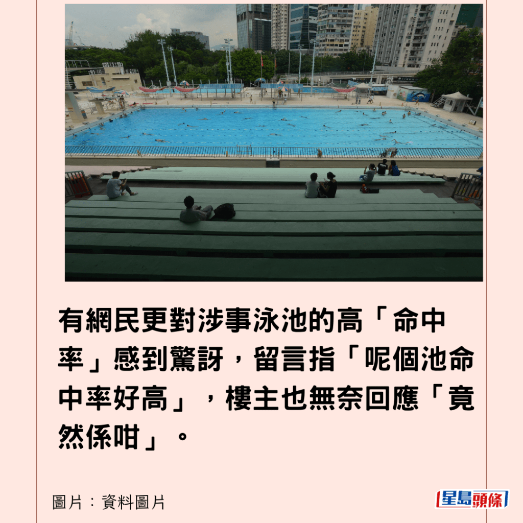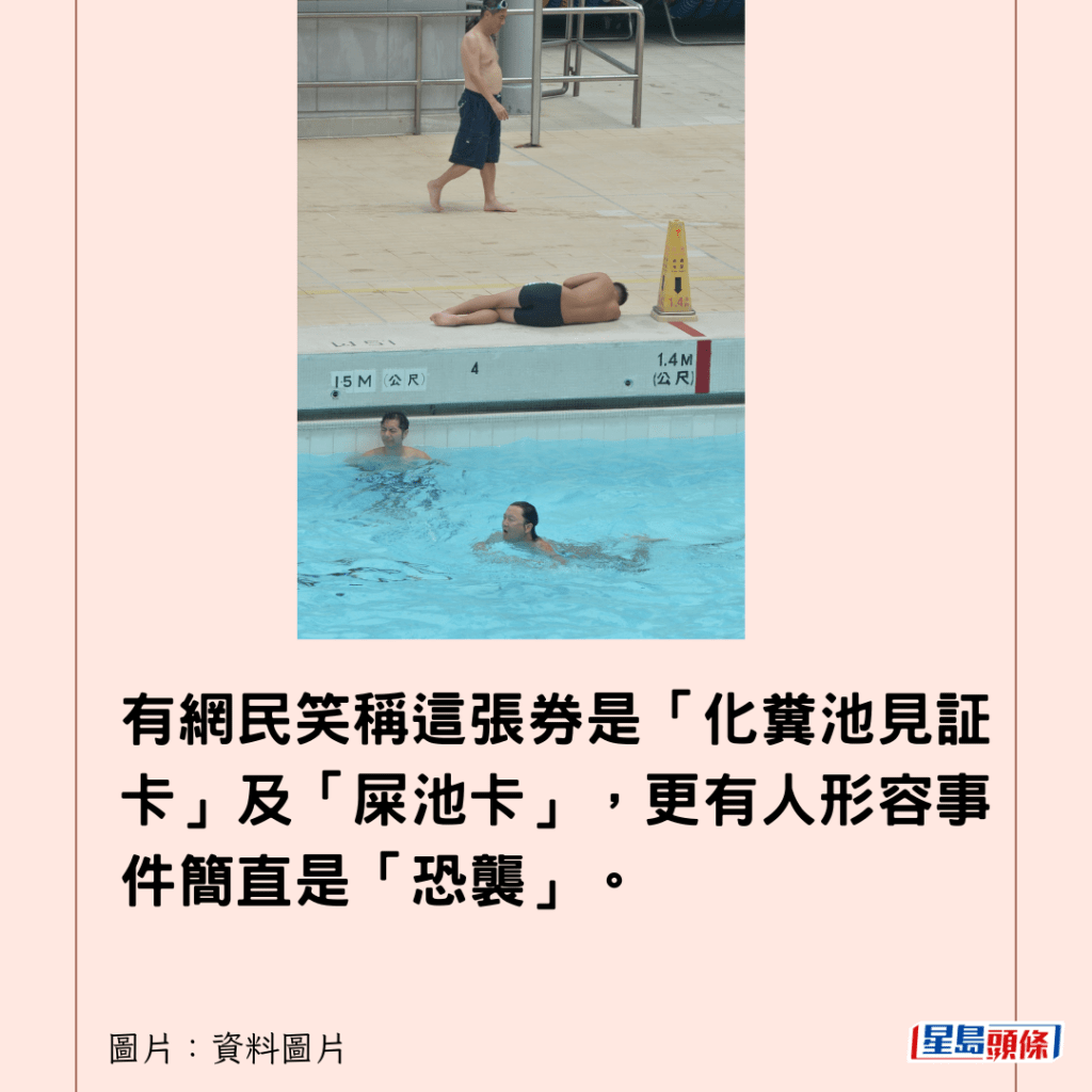 有網民笑稱這張券是「化糞池見証卡」及「屎池卡」,更有人形容事件簡直是「恐襲」。有網民更對涉事泳池的高「命中率」感到驚訝,留言指「呢個池命中率好高」,樓主也無奈回應「竟然係咁」。