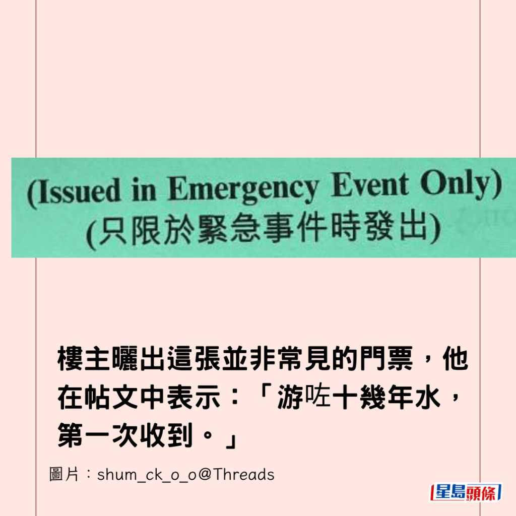 從樓主上載的相片可見,這張有獨立編號的入場券,券上以中英文特別註明「Issued in Emergency Event Only 只限於緊急事件時發出」。