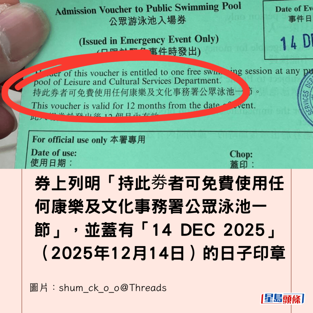 券上列明「持此劵者可免費使用任何康樂及文化事務署公眾泳池一節」,並蓋有「14 DEC 2025」(2025年12月14日)的日子印章,有效日期為發出後12個月內。