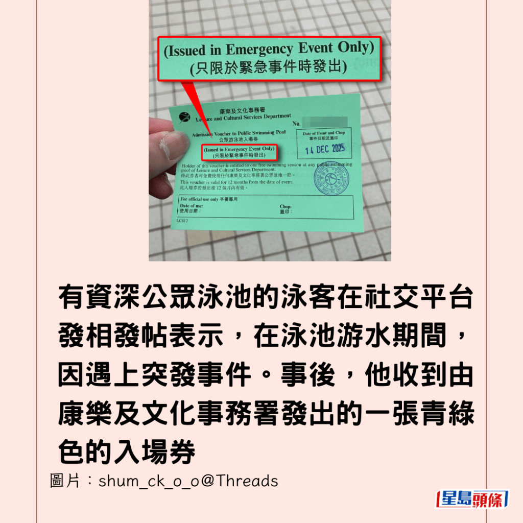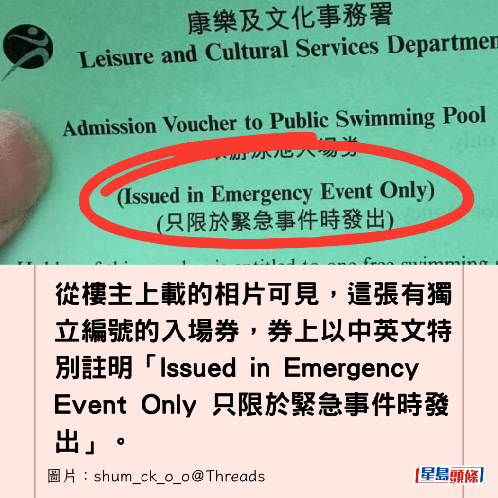 有資深公眾泳池的泳客在社交平台發相發帖表示,在泳池游水期間,因遇上突發事件。事後,他收到由康樂及文化事務署發出的一張青綠色的入場券,樓主曬出這張並非常見的門票,他在帖文中表示:「游咗十幾年水,第一次收到。」