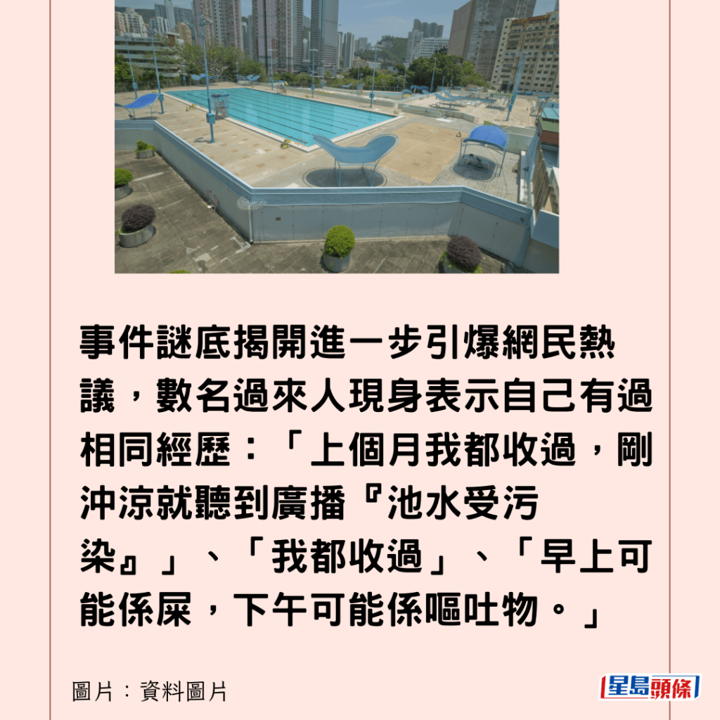 事件謎底揭開進一步引爆網民熱議,數名過來人現身表示自己有過相同經歷:「上個月我都收過,剛沖涼就聽到廣播『池水受污染』」、「我都收過」、「早上可能係屎,下午可能係嘔吐物。」